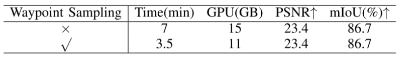 为了评估提出的Waypoint采样方法的效率,根据 KITTI 数据及构建了一个跨越 200 * 200 平方米的区域。通过Waypoint采样,实现了 2 倍的加速并减少了 GPU 内存消耗,同时保持相同的重建质量,如下表所示。