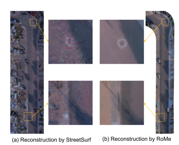 一些基于NeRF的纯视觉路面重建方法对于相机的位姿十分敏感,路面网格模糊且缺乏语义和纹理。相比之下,RoMe的网格是光滑且纹理丰富的,并且保留了原始语义。对比效果如下图所示