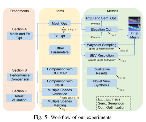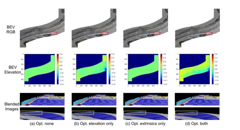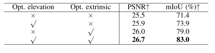 网格优化由 RGB、语义和高程优化组成,RGB 和语义优化使用可学习参数的表示,因为它们具有高频细节。在高程优化方面,采取两种方法进行对比。第一种方法将BEV elevation视为独立的可优化参数,类似于RGB和语义,另一种方法使用MLP表示。如下图所示,第二种方法产生了更好地结果。
