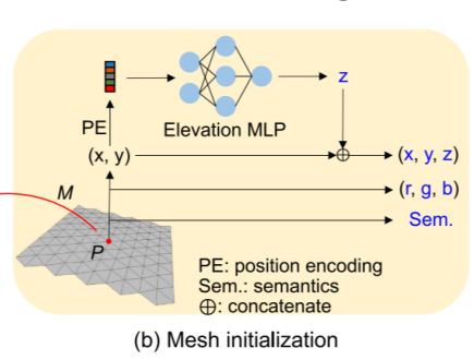 (2)网格初始化:网格中的每个顶点都由其位置、颜色和语义进行编码,并且每个顶点的海拔高度都通过MLP网络进行建模。