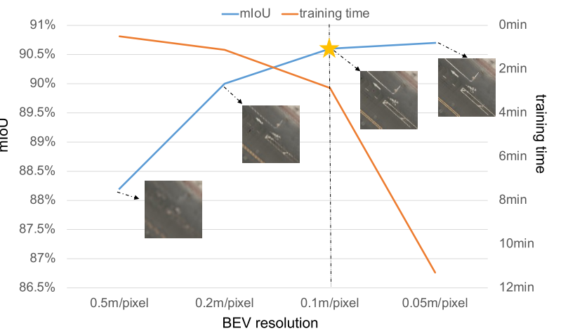 为了在训练速度和重建质量之间取得平衡,实验使用 nuScenes 数据集中的 scene-0391 进行了 BEV 分辨率实验。结果如下图所示。大于或等于 0.2m/像素的 BEV 分辨率会导致重建模糊。 相反,小于或等于 0.05m/像素的分辨率会增加不必要的计算开销。 因此,0.1m/像素的分辨率是质量和速度权衡的最佳选择。