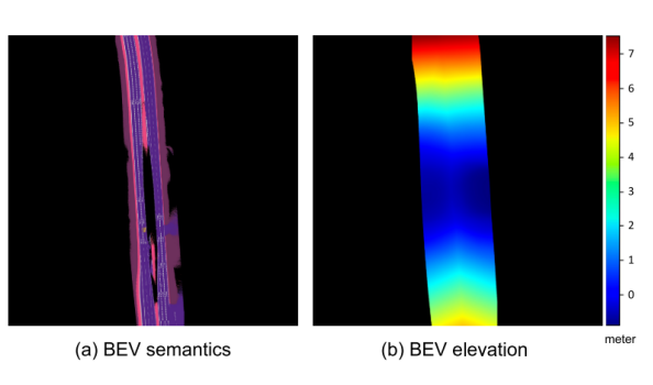 为了进一步说明学习BEV高程的强度,实验选择了重庆的一个陡坡场景。下图显示了RoMe的重建。 左侧代表 BEV 语义,右侧展示 BEV 标高,范围从 -0.8 米到超过 7 米。 尽管海拔发生了显著变化,RoMe 仍提供了清晰准确的重建。