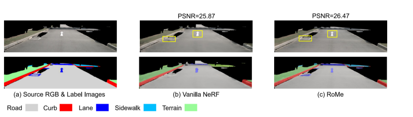 如下图显示了RGB重建以及分割结果。RoMe提供了更真实的RGB重建和精确的语义结果。黄色框中突出显示的道路元素比普通NeRF中的道路元素更加明显。在70 * 70平方米的区域中,RoMe在大约 8 分钟内收敛,而普通NeRF需要20小时。