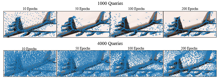 上述四幅图像分别代表在训练20个周期、50个周期、100个周期和200个周期的情况下,使用1000个查询时的所有预测输出线。以下四个图显示了在4000个查询的情况下的输出情况。图中的蓝色点是成对出现的,因为这些点对代表了预测线的两个端点。在图中呈现点而不是线段使得观察预测分布更加方便。模型训练的过程可以看作是将离散点聚集到骨架上的过程。在1000个查询的情况下,最终预测的点大部分集中在骨架上,但在4000个查询的情况下,仍然有大量点散布在图上的各个区域。在计算损失之前进行匈牙利匹配的前提下,骨架上邻近点的数量越多,在训练过程中预测点与目标点之间的距离就越小。这有助于训练点的位置。更多的预测点会使得训练模型更难以识别输出,但从直觉上看,这似乎比前者更容易学习。