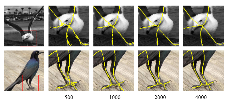 上图是不同查询下图像骨架提取的比较。结果在红色框内放大显示。