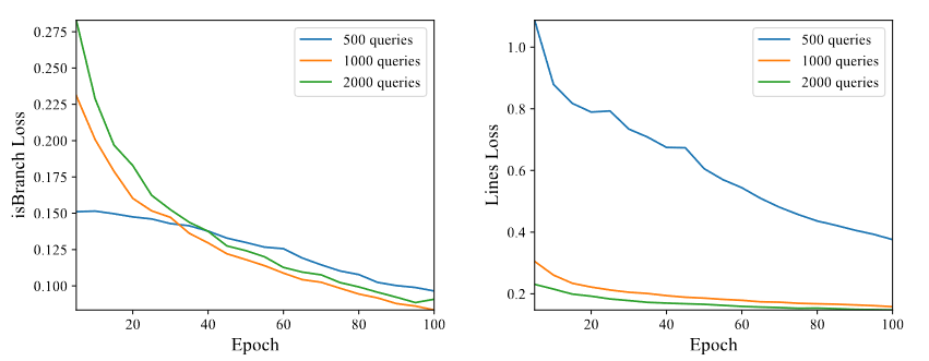 图中绘制了不同查询情况下最重要的两种损失的曲线。IsBranch Loss 限制了输出线的置信度,而 Lines Loss 则指导输出线朝向骨架。与我们的分析一致,增加查询数量有效地降低了 Lines Loss。即使要训练的查询数量增加,模型只需要对更准确的点分配更高的置信度。因此,isBranch Loss 最初会增加,但随着训练的进行,损失会减小到接近较少查询结果的结果。可以看出,增加查询数量将任务的重点从定位转移到分类。