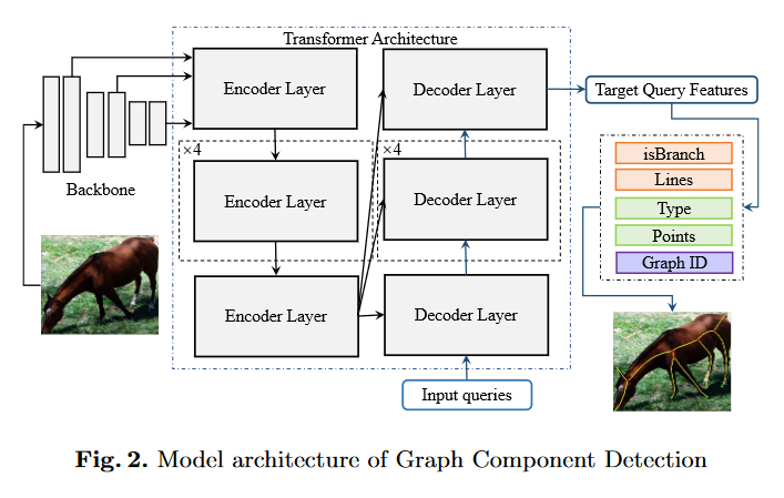 尽管这项任务是优雅而有效的,但仍然存在一些不足之处,比如在细节方面的精度不足和推理时间过长。向分解和重构骨架提取过程的转变提出了新的挑战,特别是在组件检测的准确性和在分解后的数据集上进行训练的有效性方面。高分辨率图像凸显了这些问题,特别是在线交叉点处,预测精度出现了不足,这表面了在处理高分辨率数据的细节时存在问题。BlumNet采用了基于Transformer的架构(如下图所示)来进行输出特征的编码和解码,然而,未能充分设计Transformer以更好地匹配输入和输出数据的具体性。因此,对检测模型进行适当修改可以实现更高的准确性和更稳健的结果。此外,尽管与过去的工作相比,BlumNet可以获得更高的准确性,但其推理时间更长,可能并不适用于所有应用情景。