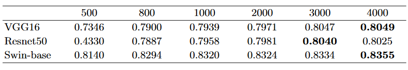 利用SK1491数据集,我们比较了六种不同query数量的情况下的结果。如表所示,在使用VGG16和Swin-base骨干网络的情况下,在SK1491数据集上达到了最佳性能,分别获得了0.805和0.836的得分。另一方面,在使用Resnet50和3000个查询的条件下,获得的最佳性能为0.804。可以观察到,初始时,随着查询数量的增加,准确性显著提高。在达到1000个查询后,准确性提升的速度减缓,但仍然存在稳定的提升。基于CNN的骨干网络通常受到查询数量的影响,需要一定数量的查询才能达到最佳结果。相比之下,Swin-Transformer即使在较少的query数量下也能表现良好。