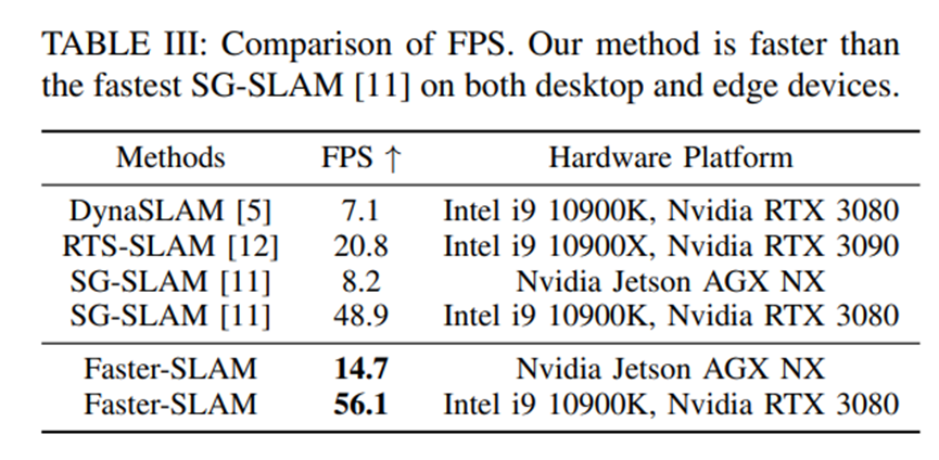 Faster-SLAM为动态环境中的实时、稳健和资源受限的视觉SLAM提供了一种有效的解决方案。与现有方法相比,它在运行稳定性和速度上都有了显著提升,同时在跟踪准确性上也取得了竞争性的结果。此外,Faster-SLAM具有很高的可移植性,可以应用于现有的利用CNN进行语义特征提取的动态SLAM系统。