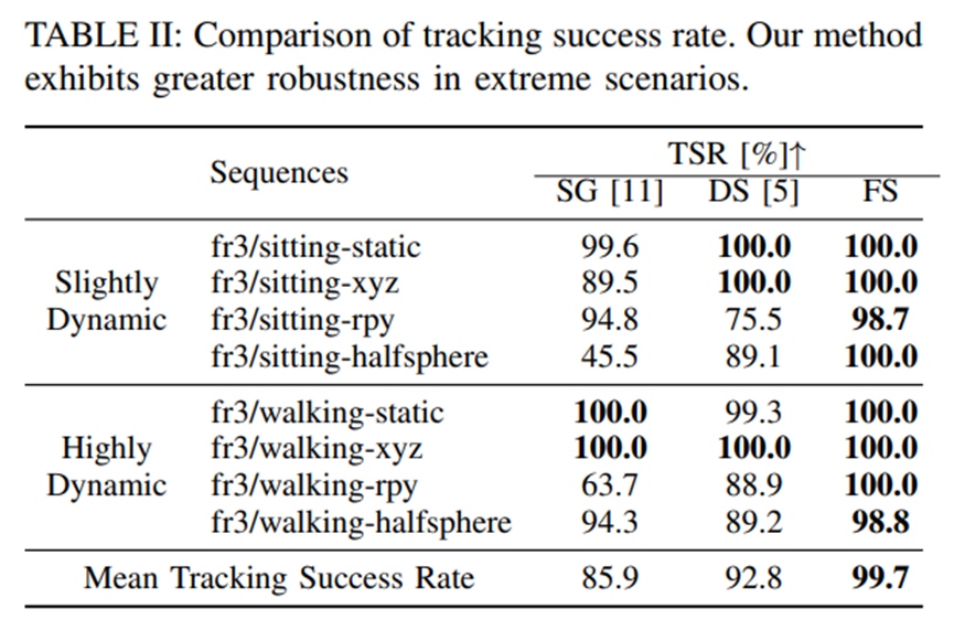 通过在广泛使用的TUM RGB-D数据集上的实验,Faster-SLAM展现了其优势:与现有的最快速动态SLAM系统SG-SLAM相比,Faster-SLAM实现了显著更高的处理速度(14.7 FPS对比8.2 FPS)和稳定性(99.7%对比85.9%),同时保持了相当的准确性。