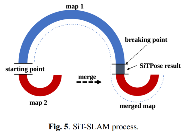 本文的处理流程如图5所示。起始点是跟踪开始的地方,断点是跟踪丢失的地方。在我们的策略下,当发生跟踪丢失时,我们的模型会在重新定位时通过2D-2D匹配快速创建第二个子地图。当第二个子图中的关键帧数达到3时,我们将前一个子图的最后一个关键帧(KF1)和当前子图的第一个关键帧(KF2)传递给SiTPose线程,用于估计旋转和平移。当当前子图稳定(关键帧数达到14)时,我们设置KF2的位姿:tkf2 = T1T2, T1, T2∈SE(3)(6),其中T1为KF1的位姿,T2为SiTPose预测的结果。随后,我们将此修改传播到第二个子地图的其余13帧,并使用SiTPose预测的姿势合并两个子地图。