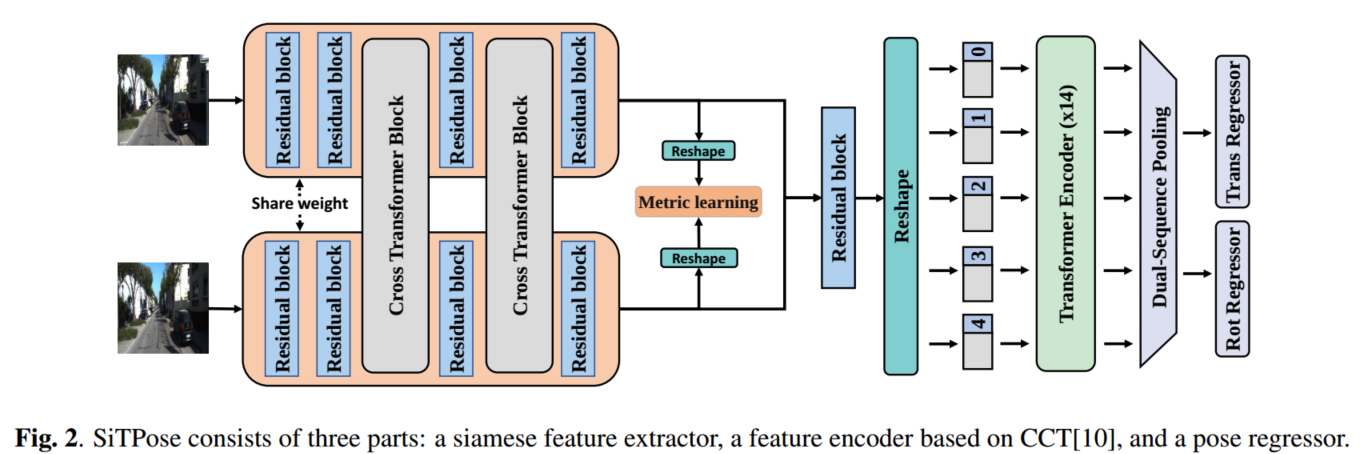 SiTPose结构如图2所示,通过SiTPose直接回归帧对的旋转和平移。采用siamese网络(孪生神经网络)交叉注意特征提取器,可以有效地保持不同尺度下的图像交互。此外,在siamese网络(孪生神经网络)的基础上增加了改进的基于注意力的特征编码器,以更好地利用图像对特征之间的交叉信息。最后,作者引入度量学习来指导提取器学习输入图像对的不同特征。文章主要贡献如下: