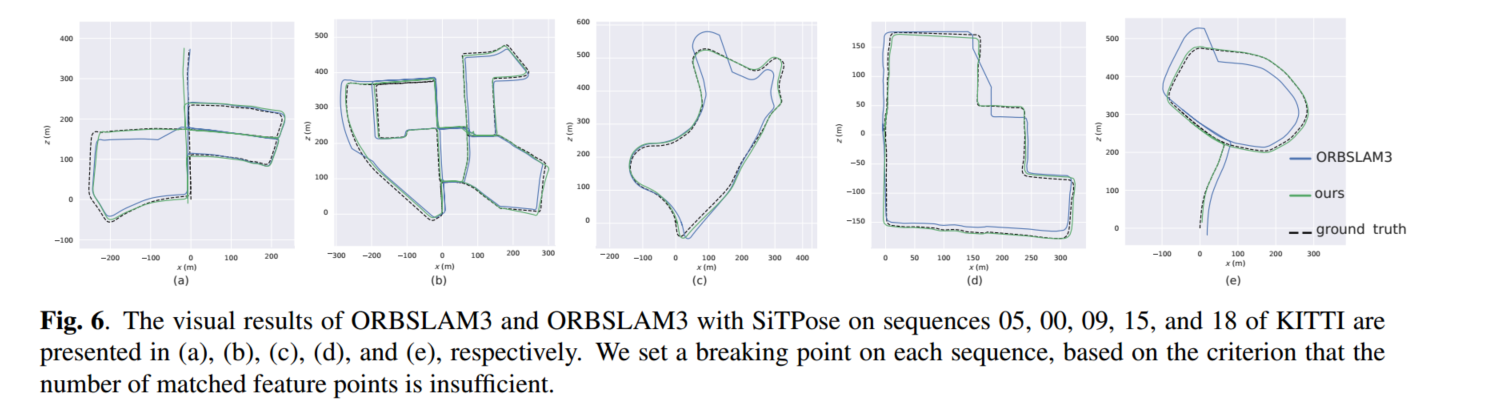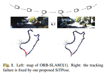 对于跟踪失败,ORBSLAM3采用如下策略:第一步是重新定位。在重新定位失败之前,新的子映射将被创建为活动映射,而前一个映射将被保留为非活动映射,以等待后续的环关闭检测来合并相关的子映射。然而,在车辆的情况下,这种策略通常会失败,导致在重定位过程中浪费帧信息。针对上述问题,我们将SiTPose集成到ORBSLAM3中来解决跟踪失败问题。