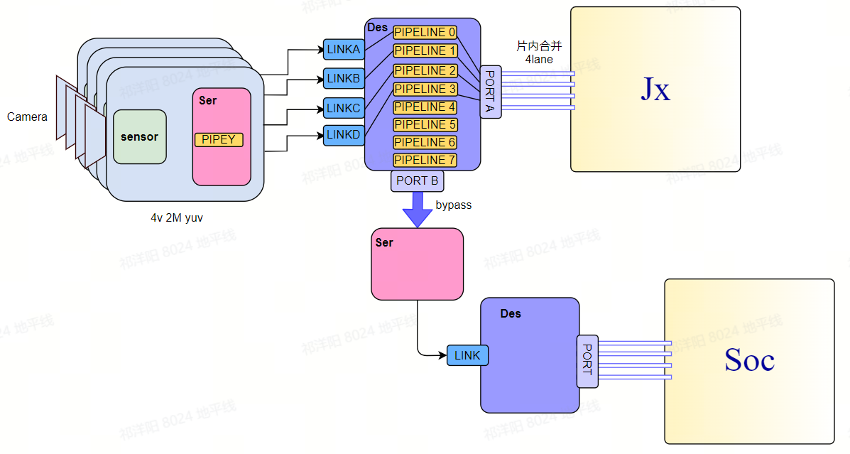 所谓bypass,指的是建立旁路数据通道,将前端camera数据送给两个SOC,如下图,4V图像数据,通过96712的port A输送给Jx(征程芯片),另外通过port B将同样的4V数据输送给另外的soc(在单soc行泊切换场景中,一般是IVI主机)。