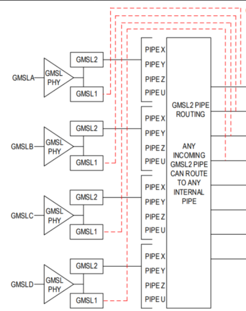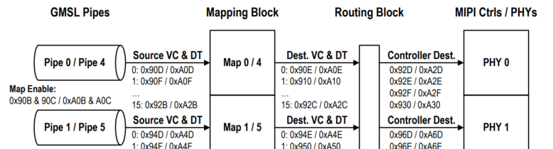 可以通过配置96712的0x06寄存器,来控制使用96712的GMSL1和GMSL2,配置寄存器0xF0~0xF4来控制96712的PIPE select。一般地,一路vc数据使用一个pipeline(一个pipeline可以传输多vc数据,此处不做讨论)。在GMSL1模式下,96712只支持4个pipeline,;在GMSL2模式下,96712支持8个pipeline。这里pipeline指的是经过前边GMSL Route后可以分配的数据通道,可以理解为line buffer。96712内有4个2lane的CSI DPHY,可以做拼接,拼成两个4lane的输出。