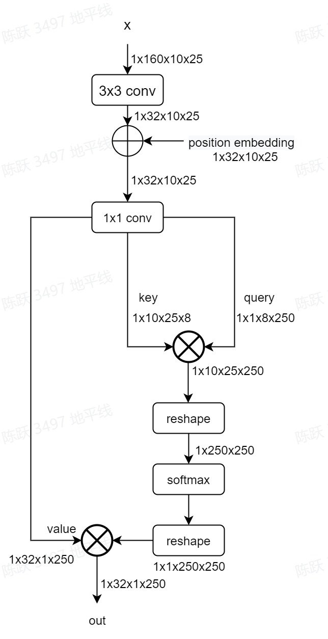 将位置编码加入到特征中,通过卷积计算生成Query(Q)、Key(K)、Value(V)向量,然后再进行如下的attention计算: