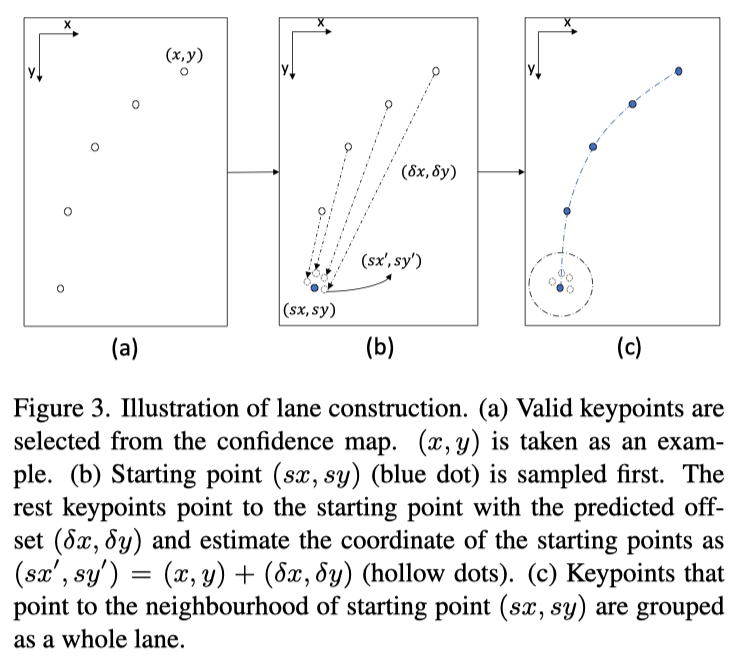 为了获得每条车道的起始点,在偏移图上选择值小于1的关键点作为候选起点。由于在同一局部区域内可能存在多个与上述标准匹配的关键点,因此选择该区域的几何中心点以确保唯一性,如上图(b)所示。通过这种方式,预先确定了所有车道的实例及其起始点。每个关键点估计车道线起始点的坐标如下所示: