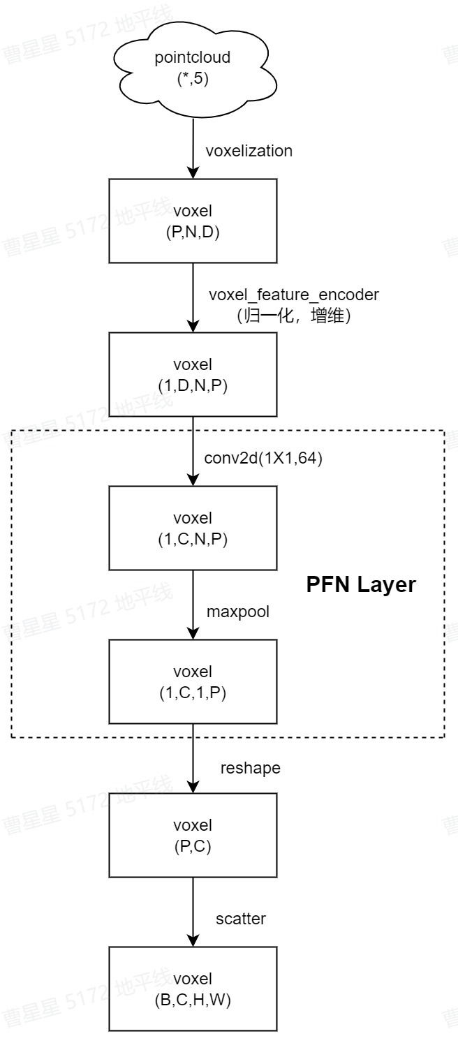 该算法主要实现将点云数据的shape (1,D,N,P)经过pfn_layers后变换为(1,C,1,P)-->(1,1,P,C)