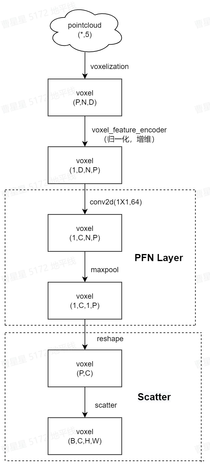 为了应用 2D 卷积架构,最终要实现将点云(P,N,5)转换为伪图像,整体步骤如下图:
