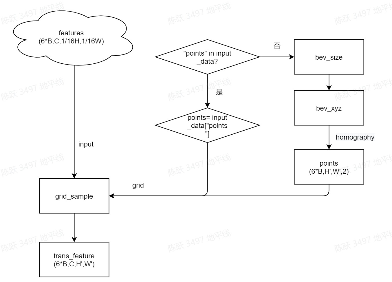 view_transformer 采用IPM映射的方法,基于摄像头的内外参把图像视角的img_features转换到bev_features。bev_shape为[H',W']为[128,128],其转换过程见下图: