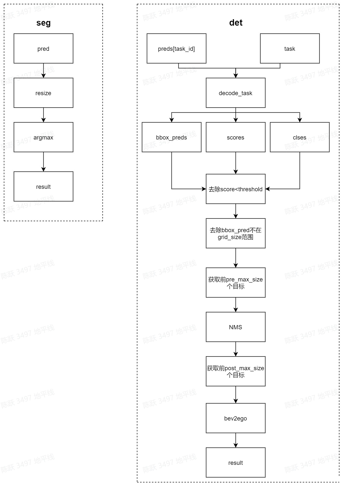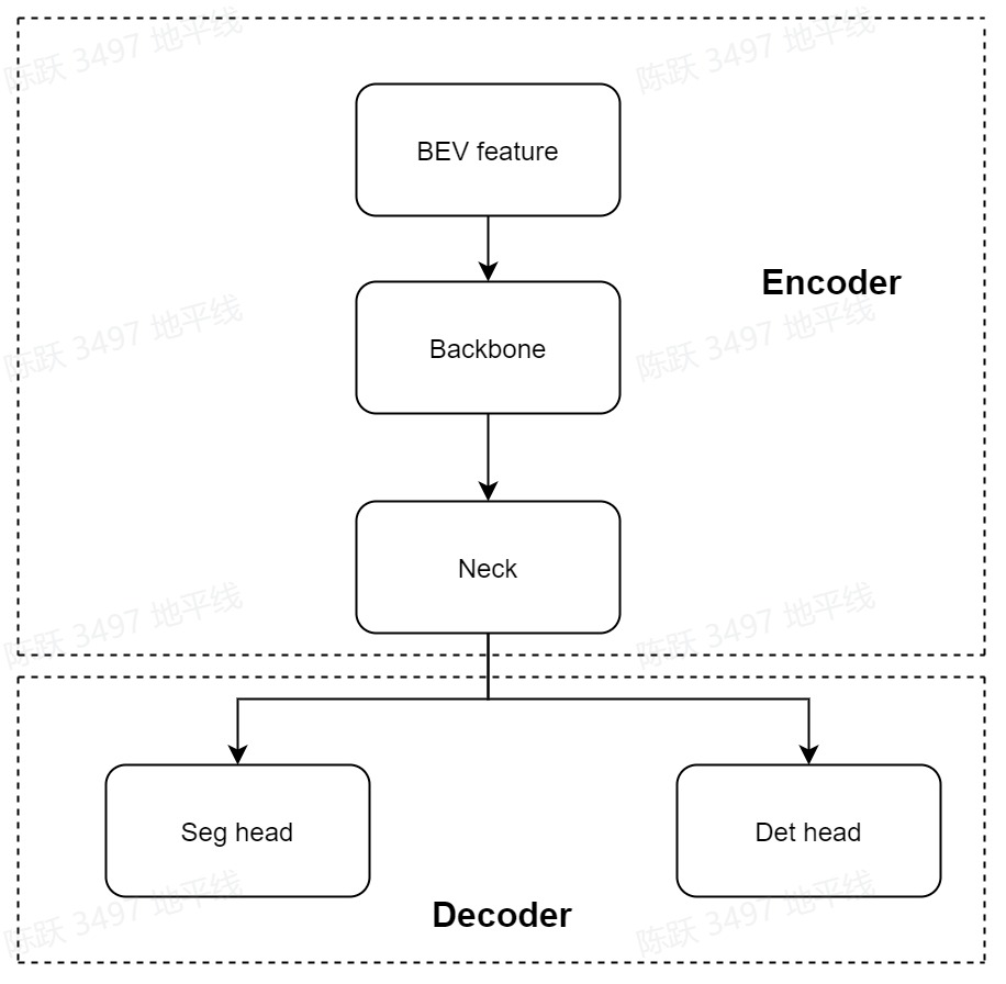 Part5—BEV Decoder:分为Detection Head和Segmentation Head。得到统一的BEV特征后,使用DepthwiseSeparableFCNHead进行bev分割,分割种类为["others", "divider", "ped_crossing", "Boundary"]。使用DepthwiseSeparableCenterPointHead进行3D目标检测任务,检测的类别为["car","truck","bus","barrier","bicycle","pedestrian"]。