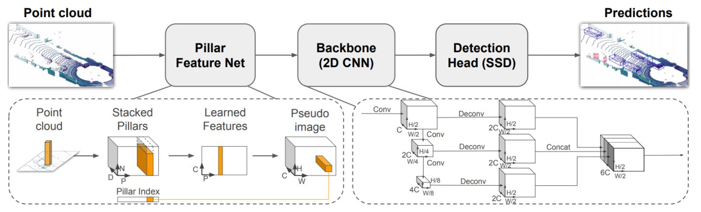 PointPillars的最大贡献是在VoxelNet中Voxel的基础上提出了一种改进版本的点云表征方法Pillar,可以将点云转换成伪图像,进而通过2D卷积实现目标检测。PointPillars整个网络结构分为三个部分: