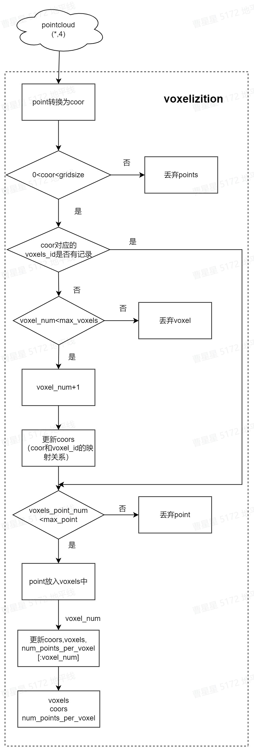 该接口是在horizon-plugin中实现,preprocess实现voxelization过程,主要是将点云数据根据预设size划分为一个个的网格。凡是落入到一个网格的点云数据被视为其处在一个 voxel里,或者理解为它们构成了一个 voxel。voxelization的实现流程见下图: