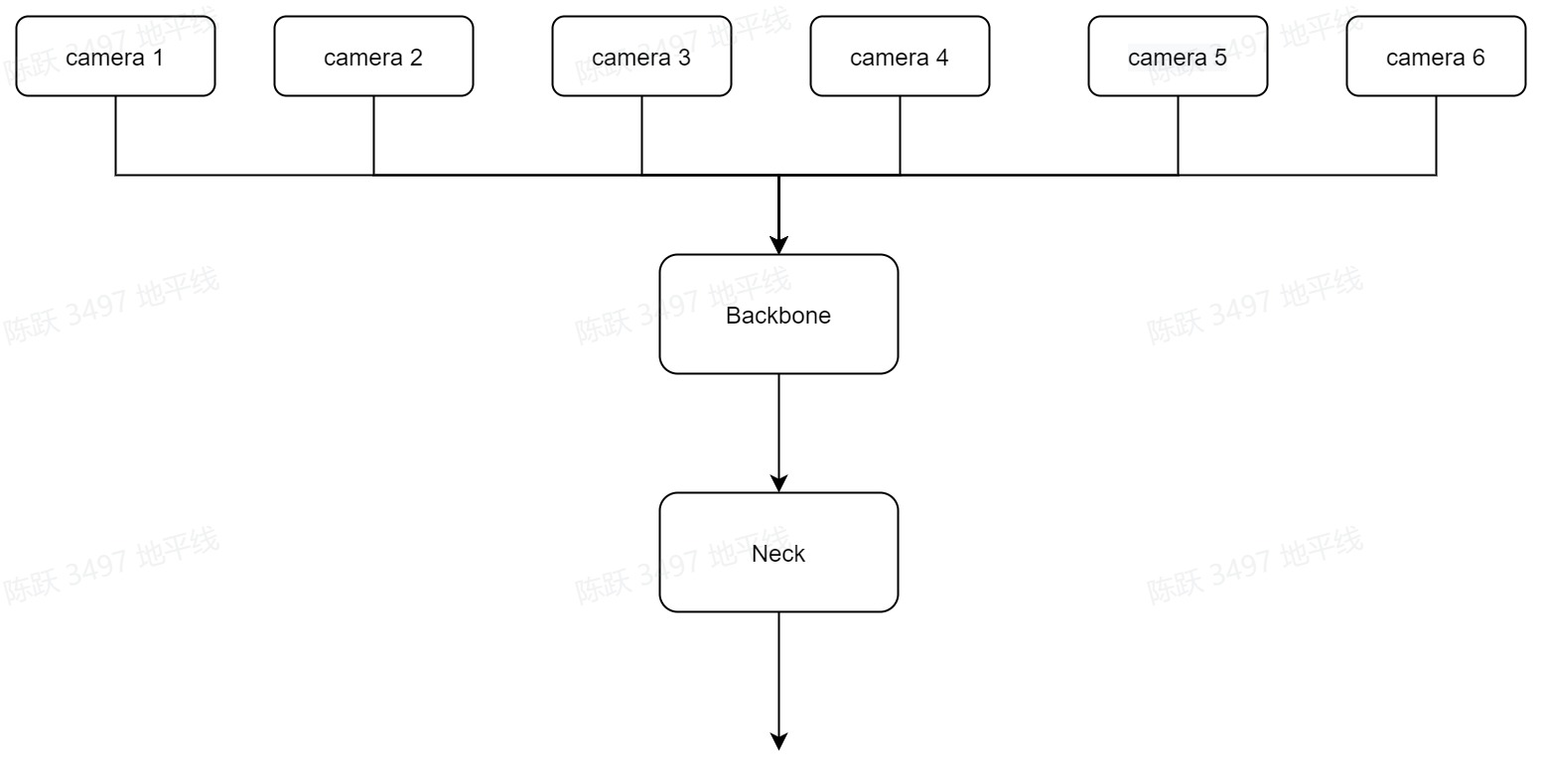 来自6个view的image作为输入通过共享的backbone(MixVarGENet)和neck(BiFPN)输出经过encoder后的feature,feature_shape为(6*B,C,1/16H,1/16W)。encoder即对多个view的img_feature 做特征提取,过程见下图: