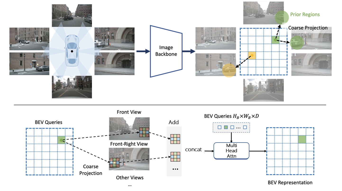 bev_mt_gkt 使用多视图的当前帧的6个RGB图像作为输入,输出是目标的3D Box和BEV分割结果。多视角图像首先使用2D主干获取2D特征。然后投影到3D BEV视角。接着对BEV feature 编码获取BEV特征。最后,接上任务特定的head,输出多任务结果。gkt的贡献在于使用相机参数作为指导而不过多依赖,对相机偏移产生的影响不敏感,提高模型的鲁棒性。