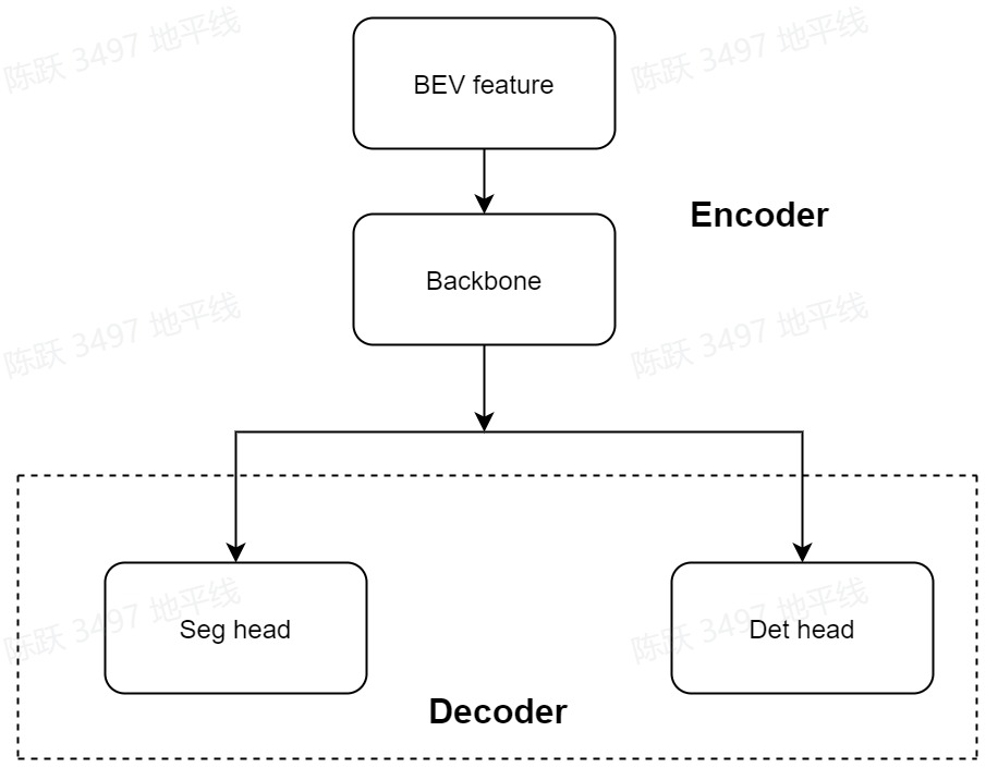 Part5—BEV Decoder:分为Detection Head和Segmentation Head。得到统一的BEV特征后,使用FCNHead进行bev分割,分割种类为["others", "divider", "ped_crossing", "Boundary"]。使用VargCenterPointHead进行3D目标检测任务,检测的类别为["car","truck","bus","barrier","bicycle","pedestrian"]。