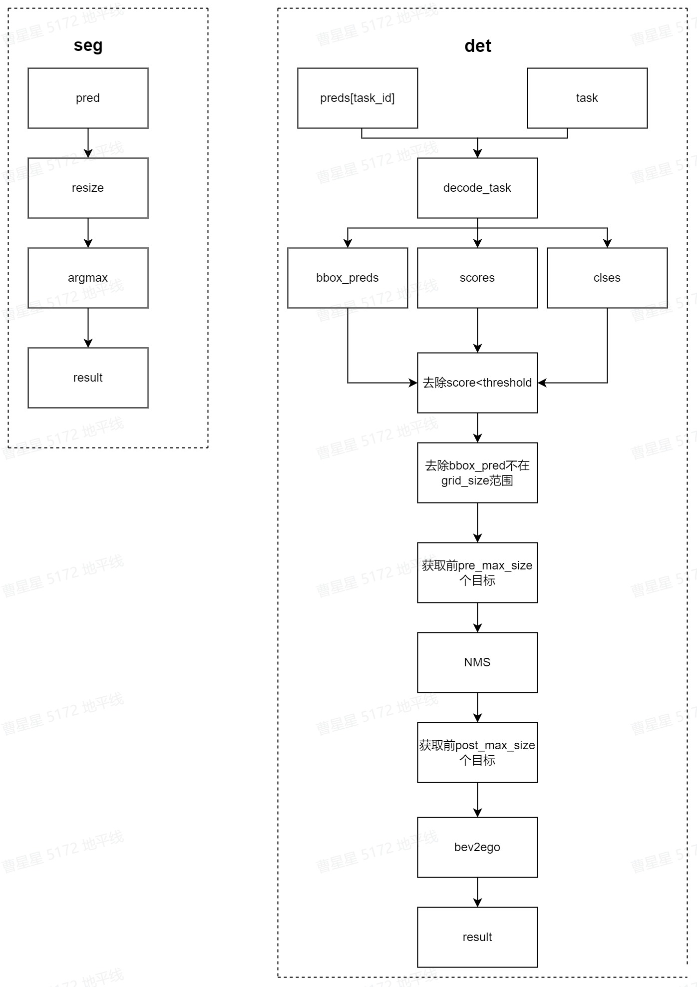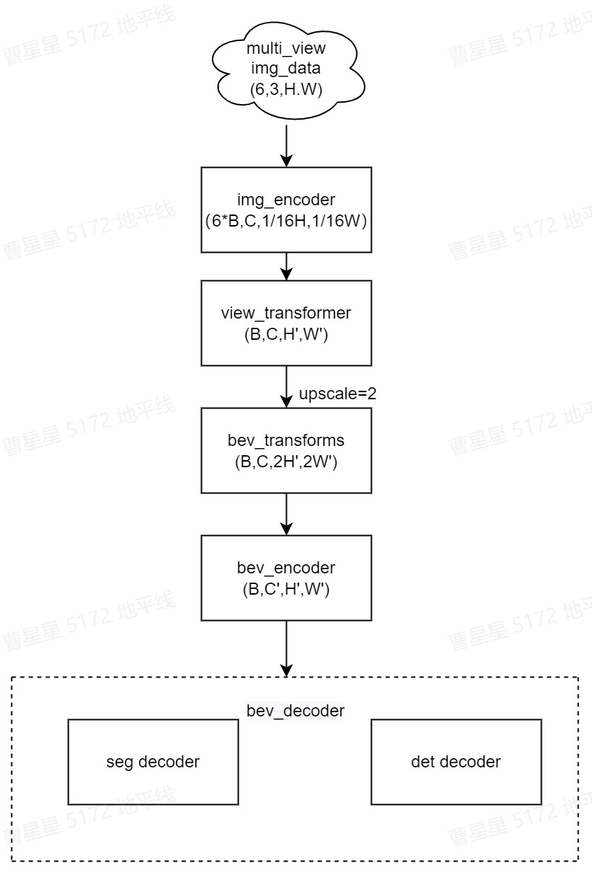 Part5—BEV Decoder:分为Detection Head和Segmentation Head。得到统一的BEV特征后,使用DepthwiseSeparableFCNHead进行bev分割,分割种类为["others", "divider", "ped_crossing", "Boundary"]。使用DepthwiseSeparableCenterPointHead进行3D目标检测任务,检测的类别为["car","truck","bus","barrier","bicycle","pedestrian"]。