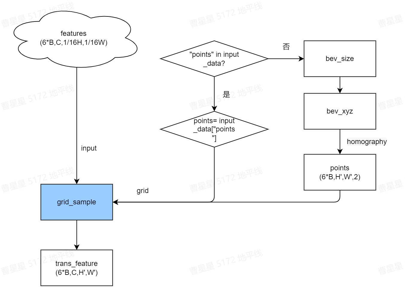 grid_sample的输入为多个view的img feature,经过bev 转换后将进行多view的特征融合,如下图所示: