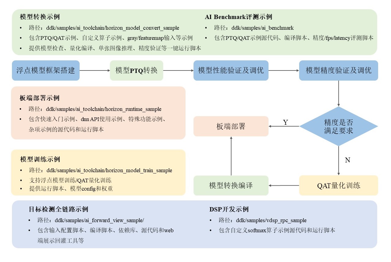 其中,ddk/samples目录中提供了模型训练示例、浮点模型转定点模型示例、定点模型上板部署示例、AI Benchmark评测示例、目标检测全链路示例和DSP开发示例。下图为工具链使用的一般流程和示例的分布,让我们一起来看一下工具链各使用阶段分别有哪些示例吧: