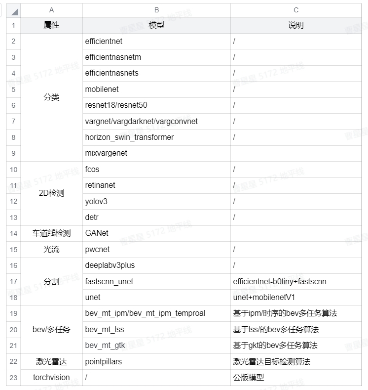 地平线为加速使用者算法开发和方案部署提供了多个参考算法示例。这些示例是基于地平线的深度学习框架HAT(Horizon Algorithm Toolkit)下开发实现的,其中包括基础示例模型和智能驾驶领域的热点模型,具体包含的场景见下图。参考算法不仅涵盖了经典的场景模型,还对热点模型-transformer类的大模型也提供了多个应用示例,同时支持多种bev转换方式。这些示例模型均可直接在J5上编译、部署,参考算法的作用是帮助使用者可以快速完成模型的J5模型部署、加速落地。同时参考算法提供了多个对J5友好的模型结构以便你可以快速搭建出自己的模型或可基于参考模型二次开发以减少投入成本。从支持经验和使用反馈表现来看参考模型在快速适配J5上有很大价值!