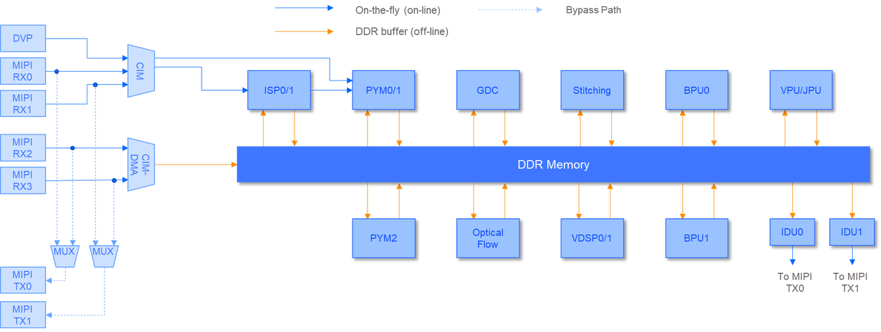 相机RAW data 经过CIM-DMA模块写入DDR,ISP/PYM/BPU等模块都从DDR上读取数据进行处理后再写入DDR。