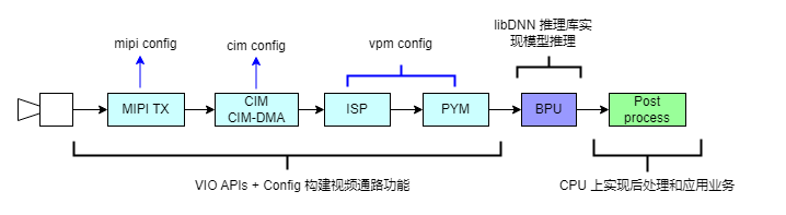 从Camera接入,到神经网络处理的最基本的数据流如下所示,每个硬件模块的工作模式通过JSON配置文件进行配置,重点会涉及到三个重要的配置文件:mipi config、cim config、vpm config,后文将有更多的解读。