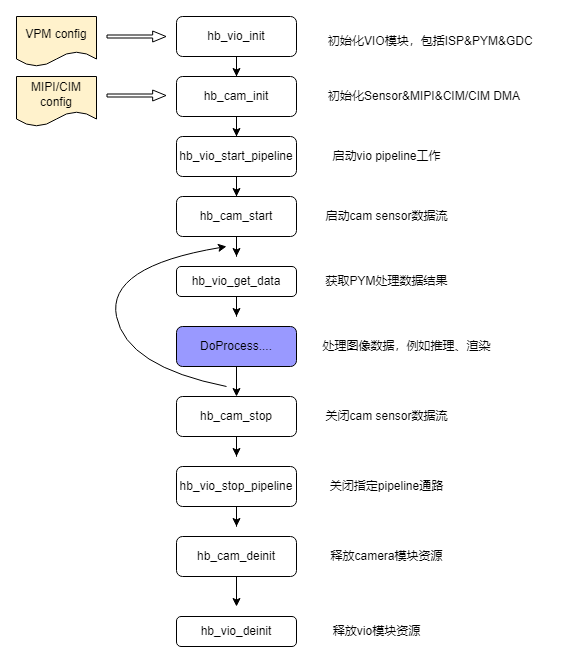 在软件层面如何初始化各硬件模块,并实现从Camera->ISP->PYM的数据流处理,除了上面所述的几个重要的配置文件外,还需要依赖J5平台所提供的Auto媒体系统接口(VIO APIs)进行配置的加载和运行,实现数据流pipeline的的运行和图像数据的获取。下面对流程中核心的API进行简要说明。