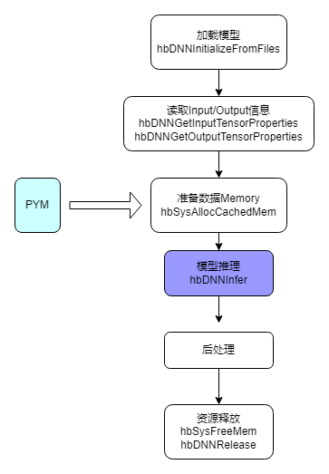 从金字塔(PYM) 输出的YUV420数据送给BPU作为视觉感知算法模型的输入,BPU上进行模型推理使用libDNN推理库提供的APIs,下图对推理的流程及使用的API做简要的介绍。