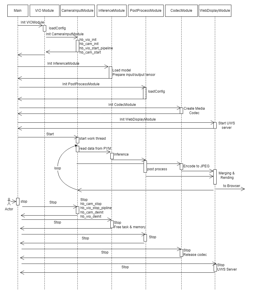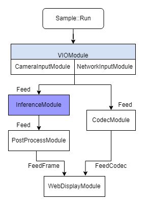 整个示例涉及到Camera的接入、图像数据处理、算法模型推理、检测结果后处理、图像编码、结果可视化渲染多个功能,为了代码实现更加清晰和解耦,设计了多个不同模块分别完成不同阶段的功能,并最大化减少相互间的依赖。