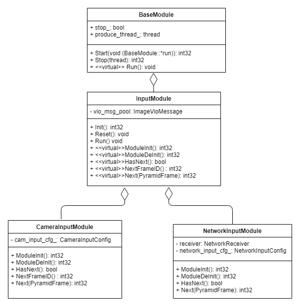 VIOModule | 视频输入模块。对Camera、网络回灌不同的输入模式进行了实现封装,根据配置文件创建不同的子模块实例(CameraInputModule, NetworkInputModule) |