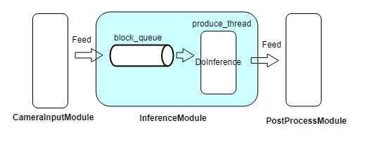 在InferenceModule中实现了数据异步处理的机制,创建了一个queue,用于缓存从上游Feed的Frame Data,在Module Start时创建的工作线程(produce_thread),从queue读取数据进行模型推理,实现上下游的执行解耦。该机制在其他Module(例如PostProcessModule)中都有使用,将不再赘述。