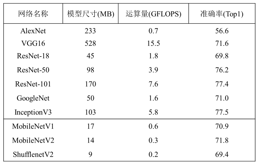 设计更加高效的网络架构,用相对较小的模型尺寸达到可以接受的精确度,例如上表中的 MobileNetV1、MobileNetV2 和 ShufflenetNetV2。