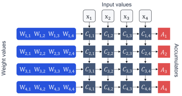 上述操作也被称为乘法累加(Multiply-Accumulate,MAC)。对于较大型的矩阵向量乘法,硬件层面进行的操作是: