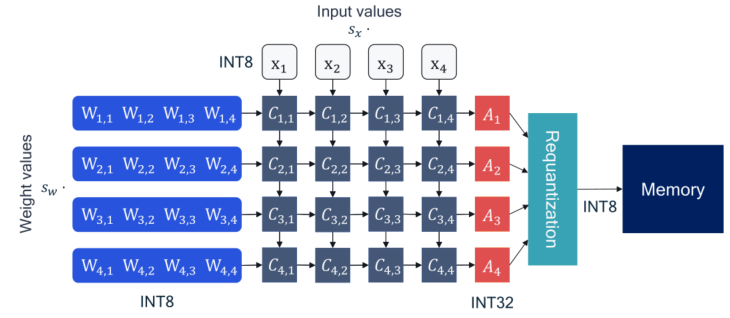 神经网络通常使用FP32类型权重参数和激活进行训练,如果基于FP32执行推理,处理元件和累加器将必须支持浮点逻辑,并且需要将32位数据从内存传输到处理单元;