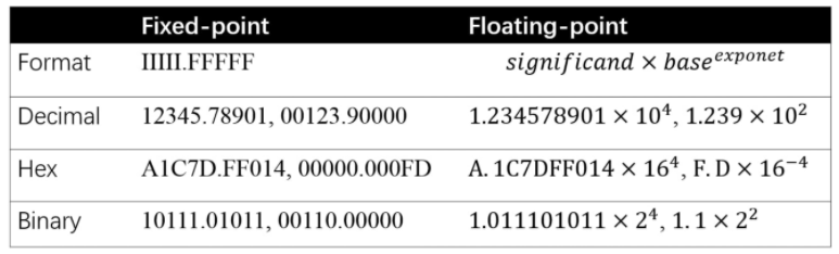 由于量化桥接了固定点(fixed point)和浮点(floating point),在接触相关研究和解决方案之前,有必要先了解它们的基础知识。定点和浮点都是数值的表示,它们的区别在于:将整数(integer)部分和小数(fractional)部分分开的点以及点在哪里。定点保留特定位数整数和小数,而浮点保留特定位数的有效数字(significand)和指数(exponent)。
