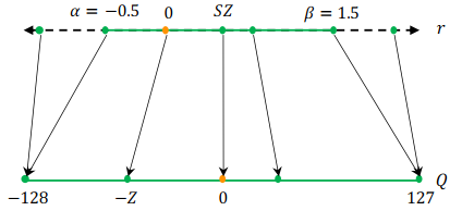 注意:当浮点运算结果不等于整数时,需要额外的舍入步骤。例如将 FP32 值域 [−1,1] 映射到 INT8 值域 [0,255],有xscalex_{scale}xscaleu200b=2/255,而xzero_pointx_{zero\_point}xzero_pointu200b=255-255/2约等于127。