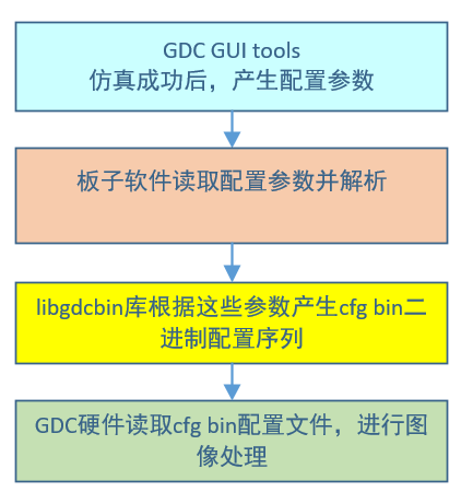 系统软件使用配置文件参数,调用libgdcbin库生成GDC cfg bin 二进制序列,供GDC硬件读取处理。 - GDC硬件