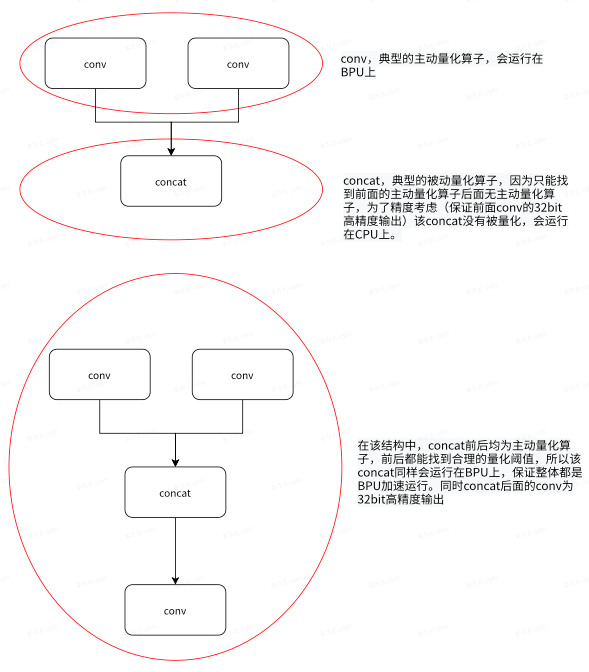 而第二个子结构中的concat,因为前后都有主动量化算子,则该concat也会被动的跟随被量化,保证所有conv+concat+conv都在一段BPU上运行。