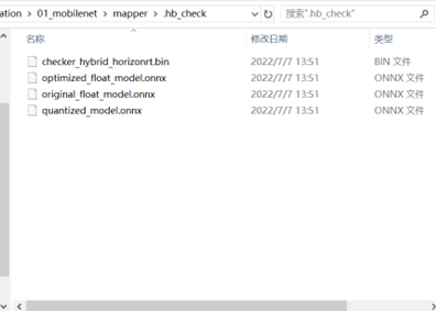 上面输出结果的 46 行到 77 行,每行都代表一个模型节点的 check 情况,每行含 Node、 ON、Subgraph 和 Type 四列,分别为节点名称、执行节点计算的硬件、节点所属子图和节点 映射到的地平线内部实现名称。脚本执行后生成.hb_check 目录: