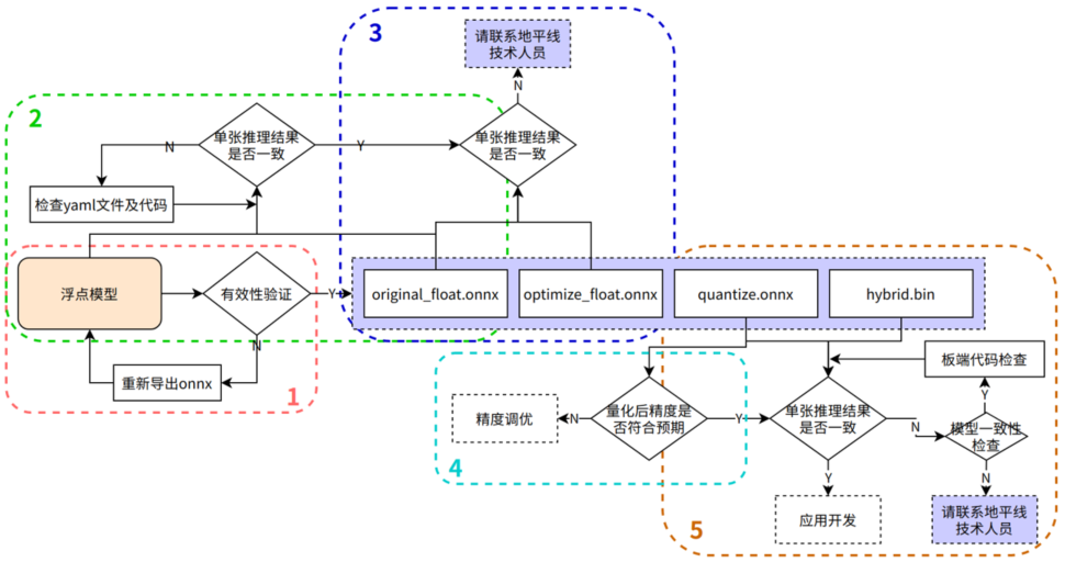 2 | 确保yaml配置文件以及前后处理代码的正确性 | 测试original_float.onnx模型的单张结果,应与浮点onnx推理结果完全一致(nv12格式除外,由于nv12数据本身有损,可能会引入少许差异) | 请参考后文:1.2 yaml配置文件与前处理代码详解 |